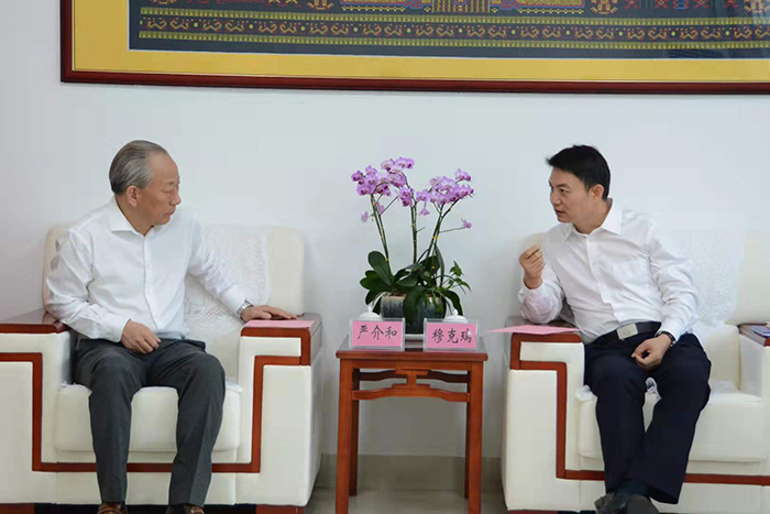 11月1日 ,,,,,,严介和理事长应邀同海南省保亭县委书记穆克瑞谈判 ,,,,,,双方就开展地企合作等问题举行了交流。。。。。庄重建设董事局主席金亮、地球村建设董事局主席胡童全程陪同。。。。。